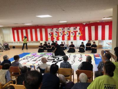 つくば市の福祉施設からご招待を受け、本校書道部が敬老の日のイベントとして書道教室と書道パフォーマンスを行いました。午前中の書道教室では、ご高齢の方々に寄り添い、筆の動きを優しく手伝う高校生の姿が微笑ましい光景となりました。生徒たちは一人ひとりに丁寧に声をかけながら、安心して作品づくりができるようサポートしました。午後の書道パフォーマンスでは、音楽に合わせて力強く、そして優雅に作品を仕上げていく姿が披露され、参加者から大きな拍手と歓声があがりました。書道を通して世代を超えた交流が生まれ、高校生とご高齢の方々双方にとって、心温まる時間となりました。