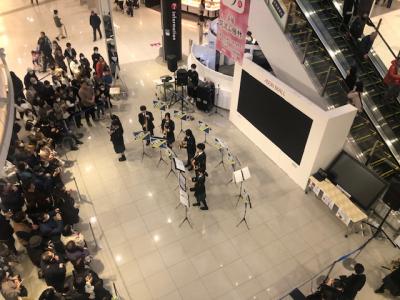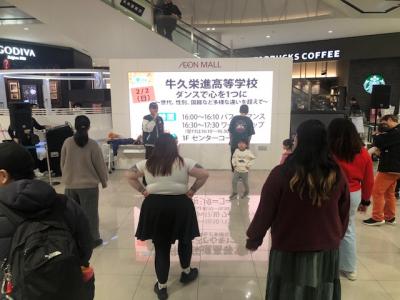 つくばイオンで開催された高校生イベントに、本校吹奏楽部とダンス有志チームが参加しました。吹奏楽部は迫力ある演奏を披露し、多くの来場者に聴いていただきました。また、3年次生によるダンスパフォーマンスには、小さなお子さんたちもたくさん集まり、一緒に手拍子をしたり笑顔を見せたりするなど、会場全体が楽しい雰囲気に包まれました。高校生の元気あふれる演奏とパフォーマンスを通して、来場者に楽しんでいただくとともに、生徒たちにとっても表現する喜びを実感できる貴重な時間となりました。