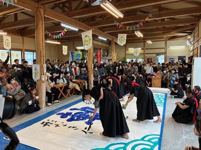 本来は牛久シャトーのサンクンガーデンで開催される予定でしたが、あいにくの雨天により、うしくつむぎの村での開催となりました。会場が変更となる中でも、生徒たちは落ち着いて準備を進め、堂々とした姿でパフォーマンスを披露しました。さらに、筑波大学2年生と大学院1年生になった書道部の先輩も駆けつけ、現役生とともに舞台に立ちました。後輩にとっては大きな刺激となり、憧れの存在である先輩の姿は、何よりの励みとなりました。現役高校生の挑戦する姿、そして温かく見守り応援してくださる地域の皆さまの存在は、栄進高校にとって大きな財産です。今後も地域とともに歩む活動を大切にしていきたいと思います。