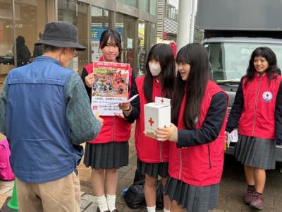 寒さの厳しい中、つくば駅周辺にてJRC部が日本赤十字社歳末助け合い募金活動に参加しました。部員たちは大きな声で「ご協力をお願いします」と呼びかけながら、通行される方々一人ひとりに丁寧に頭を下げていました。最初は緊張した様子も見られましたが、次第に笑顔で声かけができるようになり、主体的に活動する姿が印象的でした。