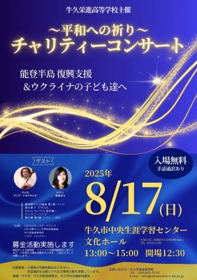 牛久市中央生涯学習センターにて、牛久栄進高等学校主催「平和への祈り~チャリティーコンサート」を開催し、約500名のお客様にご来場いただきました。また、チャリティーとして34万円を超える募金のご協力を賜り、誠にありがとうございました。皆さまからお寄せいただいた募金は、能登半島の復興支援およびウクライナの子どもたちへの支援のために寄付させていただきます。温かいご支援に心より感謝申し上げます。