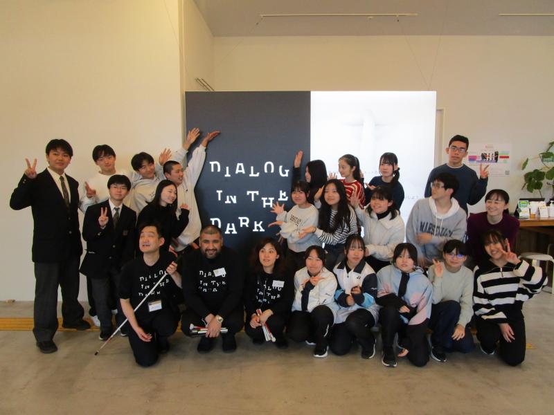 「対話の森」では、視覚障がいのある方々の案内のもと、完全な暗闇の中での体験を行いました。