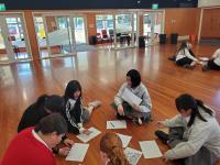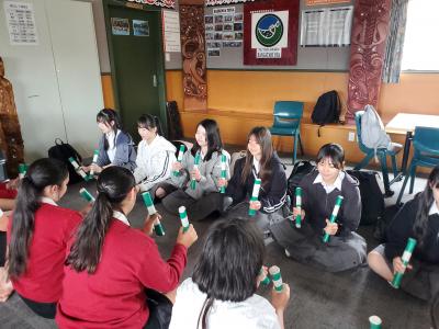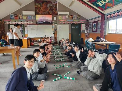「ティ・ラカウ」は木の棒を使ってリズムをとる遊びです。栄進生とカレッジ生が向かいあって座り、音楽に合わせて棒で地面を叩いたり、相手と棒を投げ合ったりして、リズムを作りました。一体感を感じるとても楽しい時間でした。