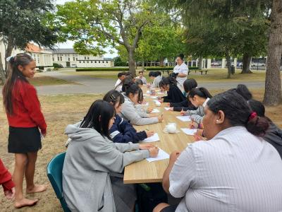 マウイ語の先生とカレッジ生に「ティ・ラカウ」と「ポイ」を教えてもらいました。