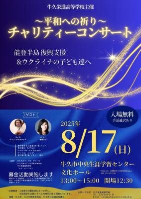 8/17(日)牛久市中央生涯学習センターにて、牛久栄進高等学校主催~平和への祈り~チャリティーコンサートを開催いたしました。