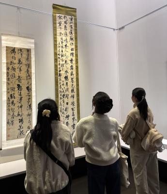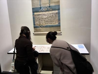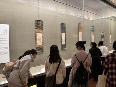 館内には、見る人を楽しませる工夫が随所にあり、研究員の中村様による高校生にもわかりやすい興味の深まる解説のおかげで楽しく鑑賞することができました。「字形の美しさだけでなく、目には見えない迫力や気韻(きいん)を感じ取ること」の大切さを教わりました。